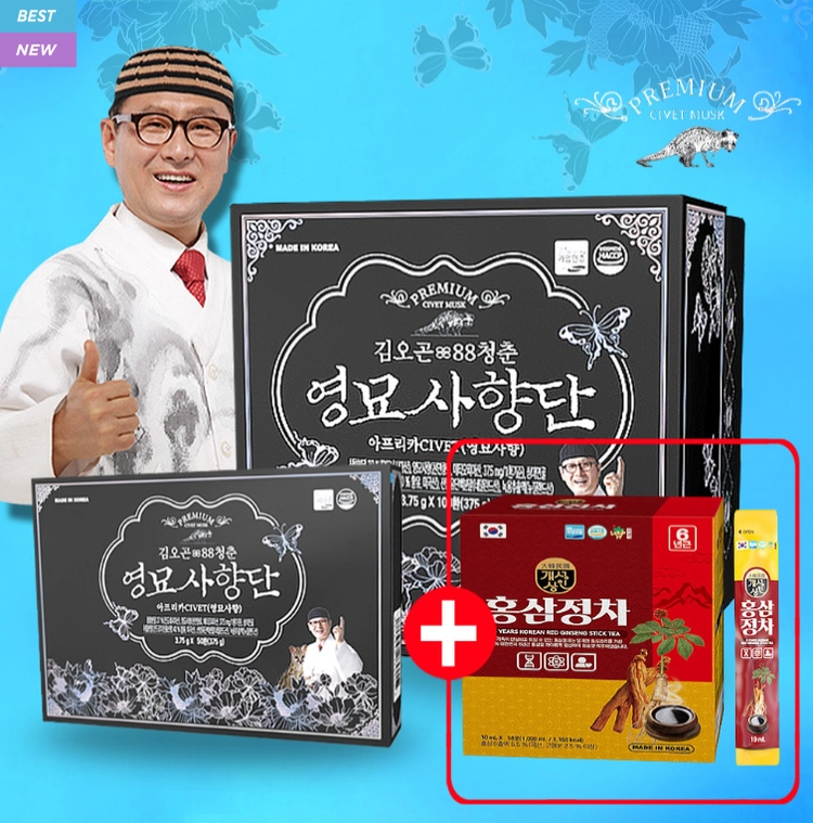 김오곤원장 88청춘 영묘사향단 150환 + 홍삼정차 50포 침향 사향 사양벌꿀 산양유 건강환 콘드로이친